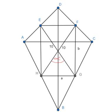 Oblicz pole deltoidu, jeśli wiadomo, że środki boków tego deltoidu wyznaczają czworokąt, którego przekątne mają długość 10 i przecinają się pod kątem α, którego sinus wynosi 0,4.