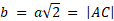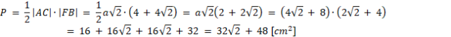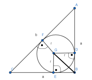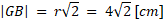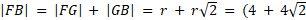 Zacznij od obliczenia długości |GB|, korzystając ze wzoru na przekątną kwadratu. Następnie oblicz długość wysokości |FB| jako sumę r i |GB|. Jako, że trójkąt ABC jest trójkątem prostokątnym równoramiennym, a |FB| jest jego wysokością wychodzącą z wierzchołka kąta prostego CBA, to |FB| =