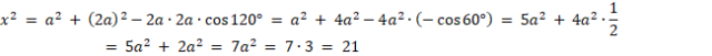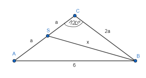 Zacznij od wyznaczenia wartości a, korzystając z twierdzenia cosinusów w trójkącie ABC. Następnie skorzystaj z twierdzenia cosinusów w trójkącie CSB, aby znaleźć długoś x.