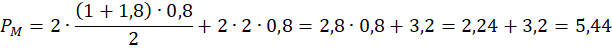 Literę M możemy podzielić na dwa takie same trapezy o wysokości równej szerokości wstążki – 0,8 i podstawach długości 1,8 i 1 oraz dwa równoległoboki o podstawie równej 2 i wysokości 0,8:
