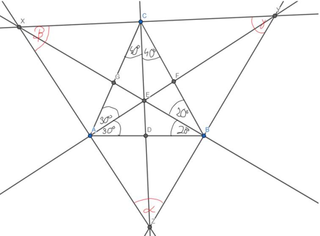W trójkącie ABC, którego miary kątów wynoszą 40°, 60° i 80°, poprowadzono proste prostopadłe do dwusiecznych wychodzących z odpowiednich wierzchołków. Punkty przecięcia tych prostych oznaczono jako X, Y i Z. Podaj miary kątów trójkąta XYZ.
