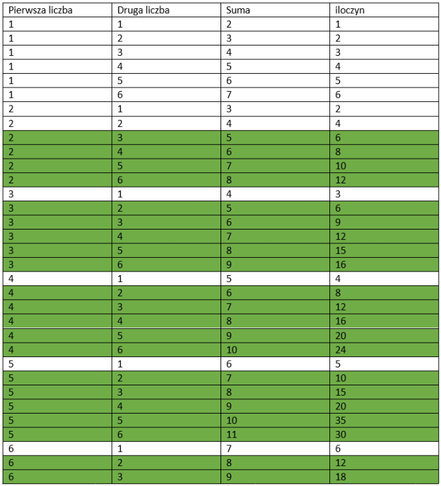 Jest 36 możliwości doboru dwóch liczb przy rzucaniu dwoma kostkami do gry. Sprawdź podany warunek dla każdej z par i następnie oblicz prawdopodobieństwo.