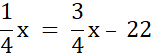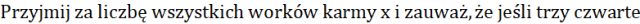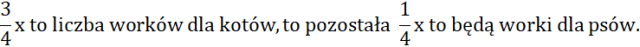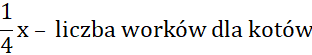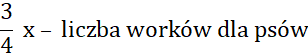 Oblicz, ile worków suchej karmy zakupiono do schroniska, jeśli trzy czwarte wszystkich worków było przeznaczone dla psów, a dla kotów kupiono o 22 mniej worków.