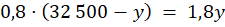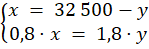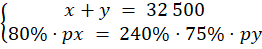Zbuduj układ równań. Pierwsze równanie: suma zainwestowana przez obie osoby to 32 500 zł. Drugie równanie: 80% z kwoty posiadanej przez Marcina po wzroście (czyli px) jest równe 240% z 75% z kwoty posiadanej przez Jerzego po wzroście (czyli py). Z pierwszego równania wyznacz x i wstaw do drugiego. Rozwiąż równanie, wyznacz y, a następnie x.