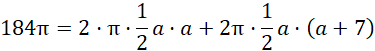 Dany jest pewien równoległobok, którego miara kąta ostrego wynosi 30°, a długości jego boków wiadomo, że ich różnica wynosi 7 cm. Z figury utworzono bryłę obrotową poprzez obrót wokół dłuższego boku. Wiedząc, że pole powierzchni całkowitej tak utworzonej bryły wynosi 184π cm2, oblicz jej objętość.