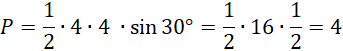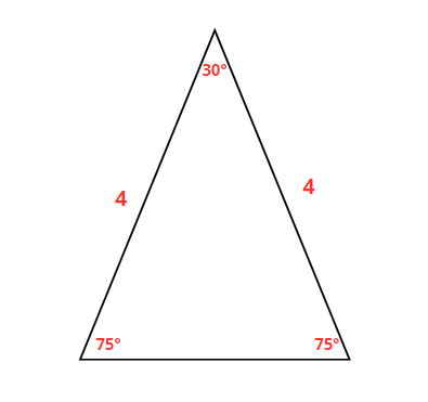 Określ pole trójkąta równoramiennego, wiedząc, iż jego ramię ma miarę 4, zaś kąty są równe 30°, 75° i 75°: