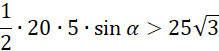 W tym zadaniu musisz powiedzieć, jaką wartość ma kąt BAC, jeśli trójkąt ma boki AB o długości 20 i AC o długości 5, a jego pole jest większe niż 25