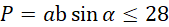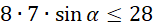 W tym zadaniu musisz powiedzieć, jaką wartość ma kąt ostry α, jeśli równoległobok ma boki o długości 8 i 7, a jego pole jest nie większe niż 28.