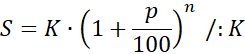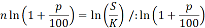 Konto jest oprocentowane p% w skali roku i wpłacono na nie kwotę K zł. Wiedząc, że co roku doliczane są odsetki, policz po upływie ilu lat, stan tego konta będzie wynosił S zł.