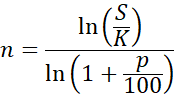 Konto jest oprocentowane p% w skali roku i wpłacono na nie kwotę K zł. Wiedząc, że co roku doliczane są odsetki, policz po upływie ilu lat, stan tego konta będzie wynosił S zł.
