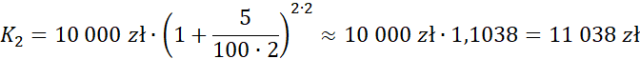 Na dwuletnią lokatę o oprocentowaniu 5% w skali roku została wpłacona kwota 10 000 zł. Ile wyniesie stan konta po upłynięciu tego okresu przy kapitalizowaniu odsetek co pół roku.