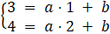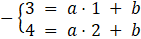 . Podstawiamy współrzędne punktów do równania prostej i zapisujemy układ równań, który rozwiązujemy, aby obliczyć współczynniki a i b tej prostej: