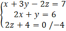 Na początku zadania musisz wyznaczyć z trzeciego równania wartość niewiadomej z. Następnie musisz podstawić tę wartość do pierwszego równania. Po przeniesieniu liczb na prawą stronę musisz pomnożyć pierwsze równanie przez -2 i dodać oba równania stronami. Z powstałego równania musisz wyznaczyć wartość y. Aby wyznaczyć wartość niewiadomej x musisz podstawić wartości innych niewiadomych do dowolnego równania i wyznaczyć z niego wartość x.