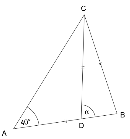 Zaznaczone na rysunku odcinki są tej samej długości. Podaj miarę kąta α.