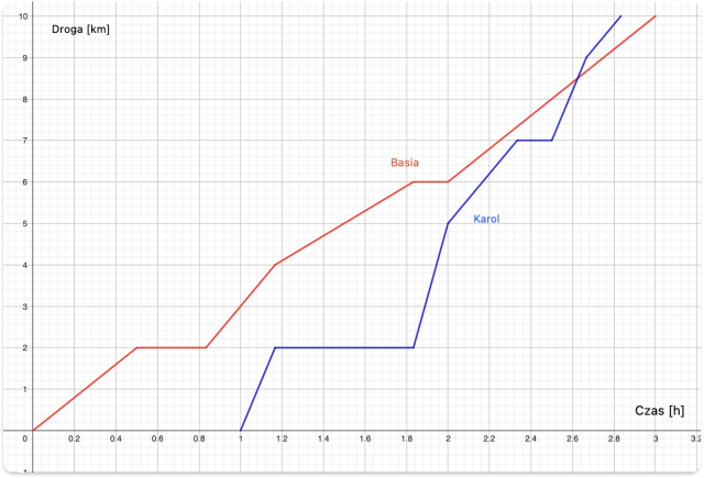 Na wykresie możesz dostrzec, że Basia przejechała całą trasę w 3 godziny, Karol rozpoczął podróż godzinę później i przyjechał 10 minut przed Basią, zatem całą trasę przejechał w 1 godzinę i 50 minut.