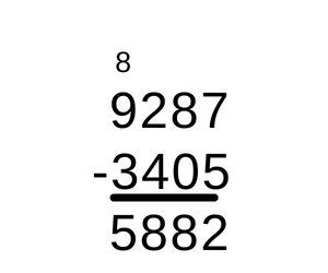 W słupku jedności należy wpisać, jaka cyfra po odjęciu 5 daje 2, jest to 7. Potem należy wpisać, jaka cyfra w słupku dziesiątek po odjęciu 0 da 8, jest to 8, ponieważ odejmowanie zera nie zmienia wartości liczby. Następnie od 2 w słupku setek, należy odjąć jakąś cyfrę, by dostać 8. Wynika z tego, że trzeba pożyć jeden od odjemnej ze słupka tysięcy i wtedy od 12 odjąć 4, by dostać w wyniku 8. Na końcu po pożyczeniu 1, z 9 zrobiło się 8. 8 minus pewna liczba da wynik 5, więc jest to 3.