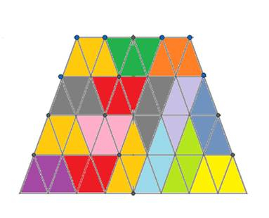 Jest to niewykonalne. Trapez ma 55 małych trójkącików – ta liczba nie jest podzielna przez 16. Spróbuj to zadanie wykonać, modyfikując trapez, obcinając mu jedno piętro z góry.