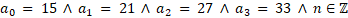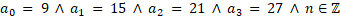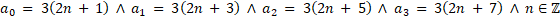 Suma współczynników wielomianu w tym przypadku jest większa od 70, ale jednocześnie mniejsza od 100. Każdy z nich jest liczbą nieparzystą (co zapisujemy jako 2n + 1, gdzie n – liczba całkowita). Ponadto są one kolejnymi takimi liczbami, więc różnią się 2. Dodatkowo są podzielne przez 3, co zapisujemy w postaci 3k, gdzie k – liczba całkowita.