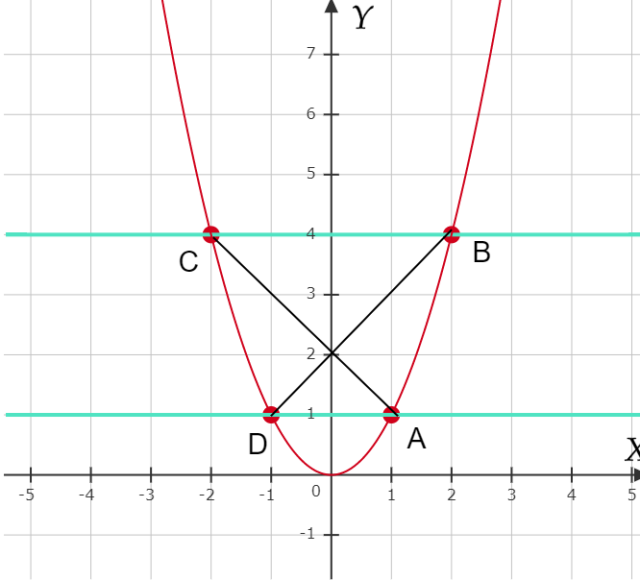 W tym zadaniu musisz naszkicować trapez ograniczony parabolą i prostymi w układzie współrzędnych i wyznaczyć punkt przecięcia jego przekątnych.