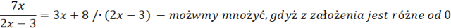 Wypisujemy i rozwiązujemy konieczne założenia. Następnie przemnażamy przez mianownik obustronnie nasze równanie, gdyż zgodnie z założeniem jest różny od zera. Doprowadzamy równanie wyjściowe do równania kwadratowego, które rozwiązujemy, korzystając ze wzorów skróconego mnożenia.