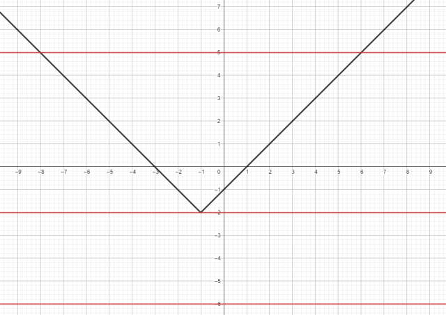 Potraktuj lewą stronę jako wzór funkcji. Rozpatrz dwa przypadki wartości bezwzględnej i stwórz szkic wykresu funkcji. Zbadaj ilość punktów przecięcia z otrzymanym wykresem prostej dla - to szukana ilość rozwiązań równania.
