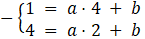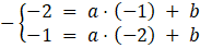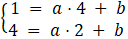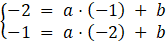 . Podstawiamy współrzędne punktów do równania prostej i zapisujemy układ równań, który rozwiązujemy, aby obliczyć współczynniki a i b tej prostej: