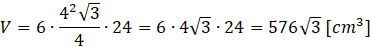 Po rozcięciu krawędzi bocznych graniastosłupa prawidłowego powierzchnię boczną można rozłożyć w taki sposób, że powstaje kwadrat o boku 24 cm. Oblicz objętość tego graniastosłupa, jeśli jego podstawa ma 6 wierzchołków.