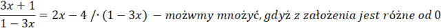 Wypisujemy i rozwiązujemy konieczne założenia. Następnie przemnażamy przez mianownik obustronnie nasze równanie, gdyż zgodnie z założeniem jest różny od zera. Doprowadzamy równanie wyjściowe do równania kwadratowego, które rozwiązujemy, korzystając ze wzorów na deltę i rozwiązania.