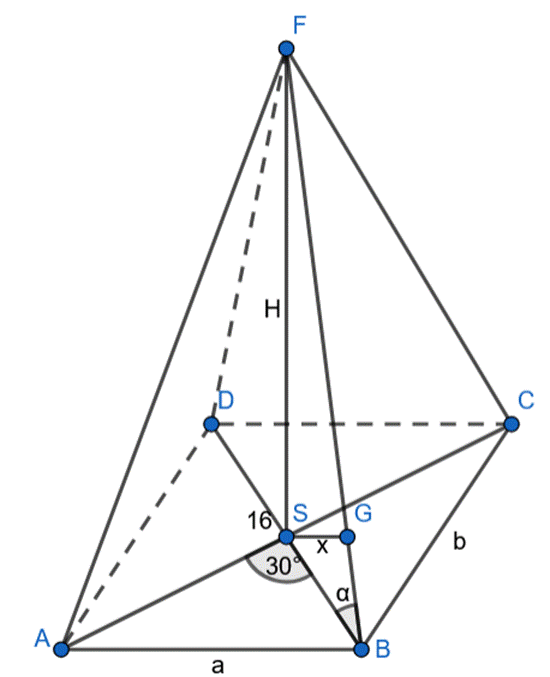 Wyznacz odległość spodka wysokości ostrosłupa od krawędzi bocznej, którego podstawą jest prostokąt, którego przekątne mają długość 16 cm i przecinają się pod kątem 30°, a objętość ostrosłupa wynosi 320 cm3.
