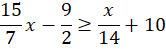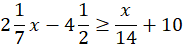 Przemnóż obie strony nierówności razy 14. Przerzuć wyrażenia z x na jedną stronę nierówności, a pozostałe – na drugą stronę. Następnie wyznacz z nierówności x. Zapisz wynik jako przedział.