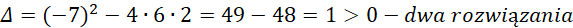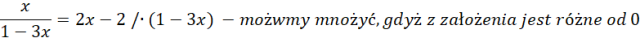 Wypisujemy i rozwiązujemy konieczne założenia. Następnie przemnażamy przez mianownik obustronnie nasze równanie, gdyż zgodnie z założeniem jest różny od zera. Doprowadzamy równanie wyjściowe do równania kwadratowego, które rozwiązujemy, korzystając ze wzorów na deltę i rozwiązania.