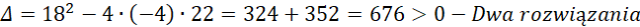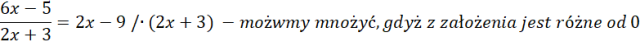 Wypisujemy i rozwiązujemy konieczne założenia. Następnie przemnażamy przez mianownik obustronnie nasze równanie, gdyż zgodnie z założeniem jest różny od zera. Doprowadzamy równanie wyjściowe do równania kwadratowego, które rozwiązujemy, korzystając ze wzorów na deltę i rozwiązania.