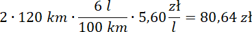 Czteroosobowa rodzina z Mławy pojechała do Warszawy do Teatru. Odległość między miastami to 120 km. Samochód zużywa średnio 6 l benzyny na 100 km. Cena 1 litra benzyny wynosiła 5,60 zł, a cena jednego biletu do teatru – 60 zł.