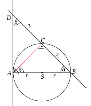 Zauważ, że kąt ACB jest prosty, ponieważ jest kątem wpisanym opartym na tym samym łuku co kąt środkowy ASB, który jest półpełny. Więc miara kąta ACB stanowi połowę miary kąta ASB.