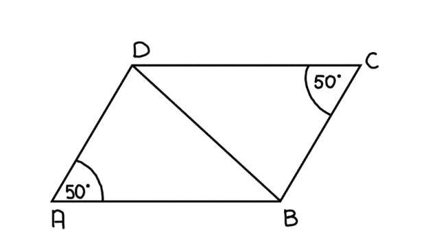 W tym zadaniu oblicz miary kątów równoległoboku, wiedząc, że jedna z przekątnych dzieli go na dwa trójkąty równoramienne, w których kąt między ramionami ma miarę 50°.