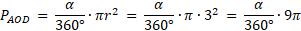 Wycinek AOD o promieniu 3 cm został podzielony na dwie części, jak przedstawiono na rysunku. Promień wycinka BOC ma długość 2 cm. Czy pole