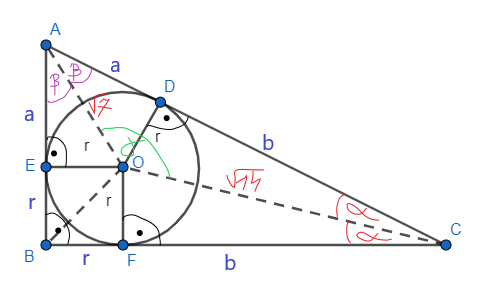 , oblicz r. Kolejno z twierdzenia Pitagorasa w trójkącie AOE oblicz a. Znając wartość a, oblicz wartość b i wypisz długości boków trójkąta.