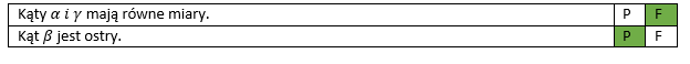 Proste a, b, c przedstawione na rysunku obok są prostymi równoległymi. Oceń prawdziwość podanych zdań. Wybierz P, jeśli zdanie jest prawdziwe, lub F – jeśli jest fałszywe.
