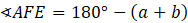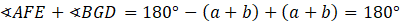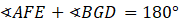 Zauważ, że kąty CAF i BGD są sobie równe. Oznacz ich miarę jako a. Miarę kątów AGD i FEC oznacz jako b. Kąt BGC jest sumą kątów BGC i CGD, więc jest równy a + b. Korzystając z sumy kątów w trójkącie AFE możemy wyliczyć, że miara kąta AFE jest równa 180°- (a + b). Suma tych kątów ma więc 180°.