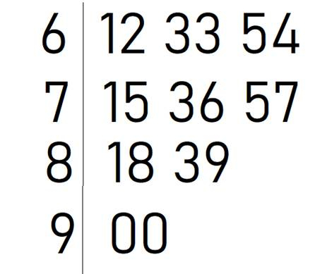 W tym zadaniu musisz przedstawić godziny odjazdy autobusu w postaci diagramu łodygowo-listowego, jeśli wiadomo, że autobus odjeżdża o godzinach: 6.12; 6.33; 6.54; 7.15; 7.36; 7.57; 8.18; 8.39; 9.00.