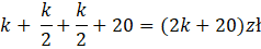 Skoro Zuzia ma dwa razy mniej pieniędzy niż Kuba, należy podzielić wartość pieniędzy Kuby przez dwa. Skoro Ania ma 20 zł więcej niż Ania, należy dodać do połowy pieniędzy Kuby 20.
