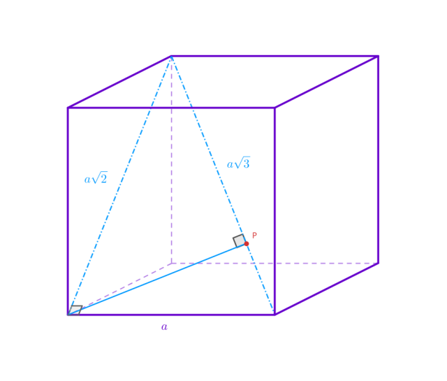 Zauważ, że taka konstrukcja tworzy trójkąt prostokątny o przeciwprostokątnej z przekątnej sześcianu. Punkt 𝑃 jest spodkiem wysokości opuszczonej na tę przeciwprostokątną. Oblicz tę wysokość, licząc pole tego trójkąta na dwa sposoby: