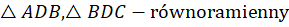 Zauważ, że trójkąty ADB i BDC są równoramienne, więc miary kątów DAB i DBA oraz CBD i BCD są równe. Skorzystaj z sumy kątów wewnętrznych w trójkącie, aby określić miarę kąta ADC.
