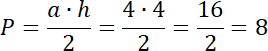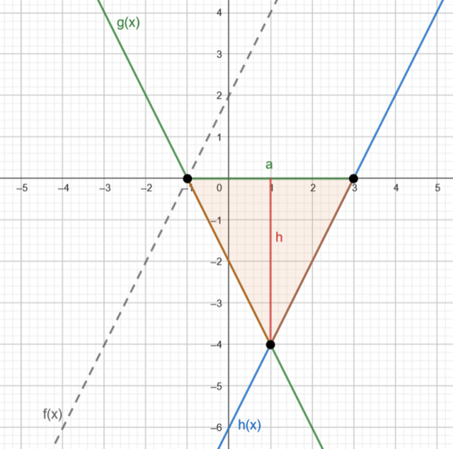 Na koniec zaznacz obszar ograniczony powstałymi wykresami i osią OX. Zauważ, że powstał trójkąt. Zaznacz podstawę oraz opadającą na nią wysokość, wyznacz ich długość i oblicz jego pole.