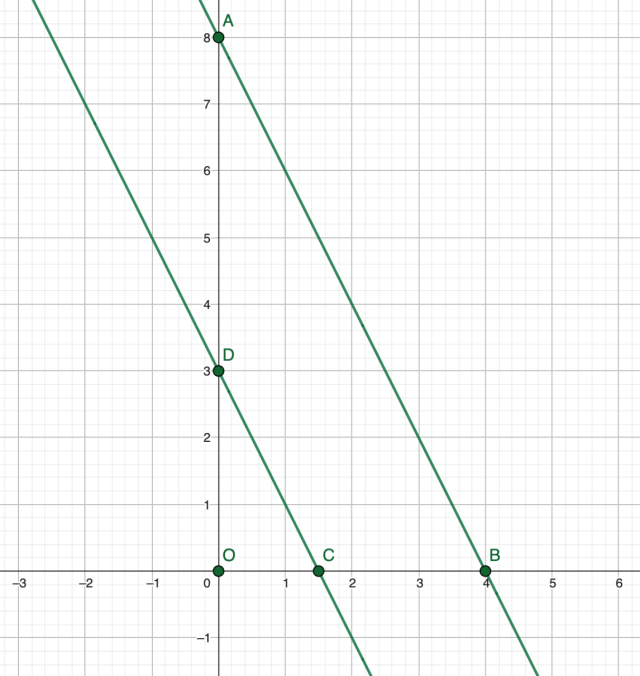 Zauważ, że utworzony trapez ma wierzchołki ABCD. Aby obliczyć pole trapezu ABCD od pola trójkąta ABO odejmij pole trójkąta DCO: ().