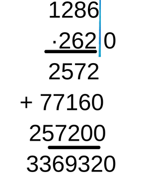 Pomnóż liczbę czcionek potrzebnych na jedną stronę przez liczbę stron, by obliczyć liczbę potrzebnych czcionek do wydrukowania całej Biblii. Jeśli przy wykonywaniu mnożenia liczby mają zera na końcu, to możesz te zera wpisać za kreską i wykonać mnożenie bez nich, a na końcu do wyniku dopisać tyle zer, ile jest za kreską. Wykonując mnożenie pisemne przez liczbę wielocyfrową, należy najpierw pomnożyć cyfrę jedności liczby, przez którą mnożysz, przez cyfrę jedności drugiej liczby. Jeśli otrzymana liczba jest dwucyfrowa, należy cyfrę jedności takiego wyniku zapisać pod słupkiem cyfr jedności, a cyfrę dziesiątek z wyniku trzeba przenieść dalej poprzez dopisanie tej cyfry nad kolejnym w lewo słupkiem, czyli słupkiem cyfr dziesiątek. Przy mnożeniu kolejnego słupka, do wyniku dodaje się przeniesioną cyfrę ze słupka wcześniej. W taki sam sposób należy mnożyć każdą kolejną cyfrę, zaczynając od lewej i idąc do prawej. Jeśli w ostatnim słupku wyjdzie liczba większa od 10, to już nie wolno przenosić dalej, bo nie ma kolejnego słupka, lecz należy napisać całą liczbę. Po pomnożeniu przez cyfrę jedności należy wykonać te same operacje, mnożąc przez kolejne cyfry, zaczynając od dziesiątek. Z każdą kolejną cyfrą, przez którą mnożysz w sekcji dodawania, dopisuj z prawej strony jedno zero. Na końcu wykonaj dodawanie pisemne. Dodawaj kolejno każdy ze słupków, począwszy od jedności, a gdy po dodaniu wynik będzie dwucyfrowy, to liczbę jedności zapisz pod tym słupkiem, a liczba dziesiątek przejdzie dalej do następnego słupka.