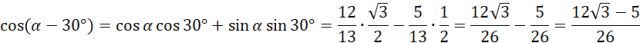 W tym zadaniu musisz policzyć cos (α – 30°), jeśli cos α =