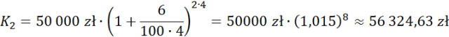 Na trzymiesięczną lokatę z oprocentowaniem 6% w skali roku zdeponowano 50 000 zł. Oblicz, ile zarobiono by na lokacie, gdyby podatek naliczyć po upływie 2 lat od całości kwoty tych odsetek.
