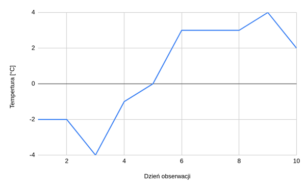 Na osi pionowej znajdują się wartości temperatur, a na osi poziomej dzień obserwacji.