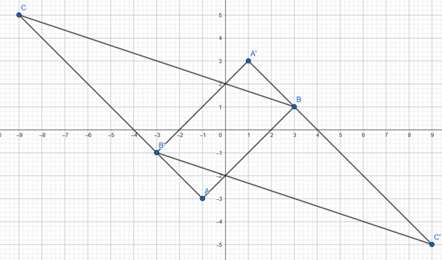 Wyznacz współrzędne wierzchołków trójkąta A’B’C’ i oblicz pole części wspólnej tych trójkątów, jeśli trójkąt A’B’C’ jest symetryczny do trójkąta ABC względem początku układu współrzędnych.
